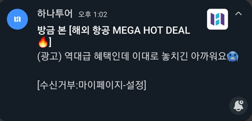 하나투어에서 보낸 앱 푸시 알림.